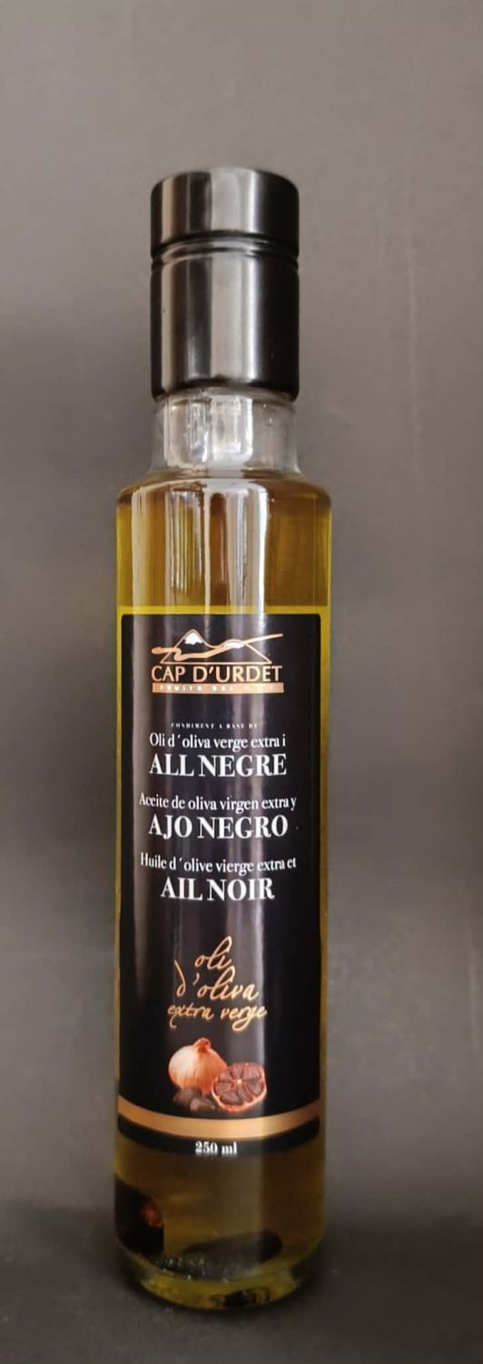 Botella 250 ml. Aceite 100% arbequina condimentado con ajo negro.